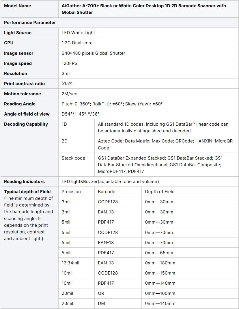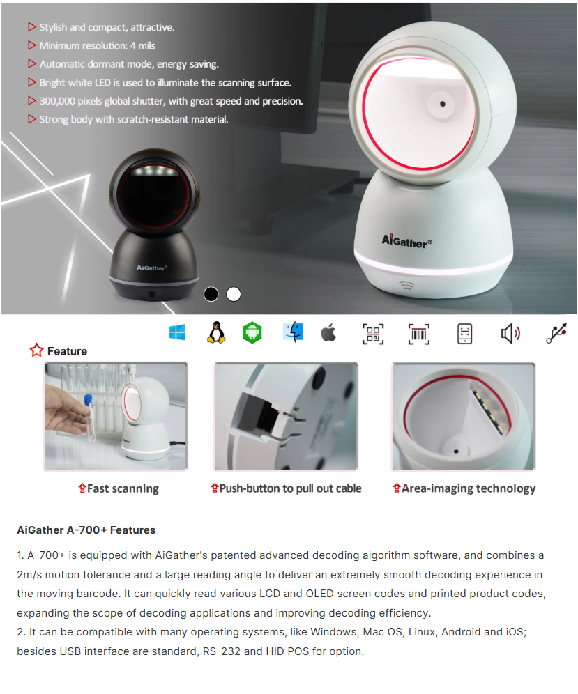 A-700+ Black or White Color Desktop 1D 2D Barcode Scanner with Global Shutter